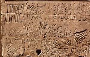 Pharao Setis Sieg über die Schasu. Im Zentrum fliehen die Schasu in ihre Festung im Gebirge, oben links bei dieser Festung zerbrechen sie besiegt ihre Waffen. Ägyptisches Relief, 13. Jhd. (c) Karnak Great Hypostyle Hall Project