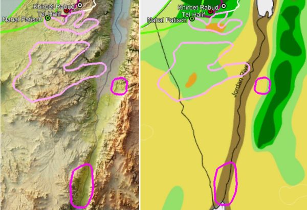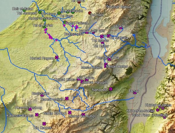 Am Schwund der Siedlungen in der Südphilistäa im 10./9. Jhd. könnten neben den Kanaanäern ein drittes Volk indirekt beteiligt gewesen sein: Die Vorfahren der Edomiter. Als in der Bronzezeit noch Ägypten die im Raum Palästinas alles dominierende Macht war, hatten die Ägypter hauptsächlich zwei Kupferquellen zur Herstellung von Bronze: Importiertes Kupfer aus Zypern zum Einen und eine oder zwei eigene Kupferminen-Gegenden in der Araba-Senke (s. rechts: pink) zum Anderen.〈q〉 In beiden Gegenden war in der Antike der Kupferabbau schwierig: In der Senke selbst und damit in der südlichen Timna-Gegend herrscht Wüstenklima (braun), in der nördlicheren Khirbet en-Nahas-Gegend saharo-arabisches Klima (gelb), beide mit einem durchschnittlichen Niederschlag von nur 20-40 mm/Jahr. Dauerhaft leben konnten Menschen hier nicht. Die nächsten lebensfähigen Regionen sind (1) theoretisch das ostjordanische Plateau im Osten mit mediterranem Klima, das aber steil auf 1500 Meter ansteigt, (2a) das flachere Negev-Gebirge im Westen der KEN-Gegend mit immerhin 70-100 mm/Jahr Niederschlag (2b) und das Beerscheba-Arad-Tal noch weiter nördlich mit 150-200 mm/Jahr (rosa). Davon, dass das Negev-Gebirge in der Spätbronzezeit überhaupt besiedelt war, zeugen nur die landwirtschaftlichen Terrassen, die dort nach den Ergebnissen von Radiokarbon- und OSL-Datierungen ab dem 13. Jahrhundert entlang der Wadis entstanden sind (s.o.). Mindestens während der Regenzeit lebten hier also Ackerbau treibende und noch in Zelten wohnende Nomaden. Die Erkenntnisse, die wir durch Ausgrabungen über die frühe Eisenzeit gewonnen haben (s. gleich), legen sehr nahe, dass es vor allem diese waren, die für die Ägypter in der Araba Kupfer abbauten: Nach dem Abzug der Ägypter aus Palästina im 13./12. Jhd. nämlich entstehen mit der beginnenden frühen Eisenzeit ab dem 12. Jhd. (vgl. bes. Ben-Yosef u.a. 2012) zunächst in der KEN-Gegend noch weitere Kupferminen und Khirbet en-Nahas selbst wird als kleiner Gebäudekomplex mit Kasemattenmauer errichtet. Auch in Timna wird nach einer kurzen Unterbrechung im 12. Jhd. der Betrieb wieder aufgenommen und wohl im 10. Jhd. mit Jotvata ein ähnliches Gebäude wie in Khirbet en-Nahas gebaut.