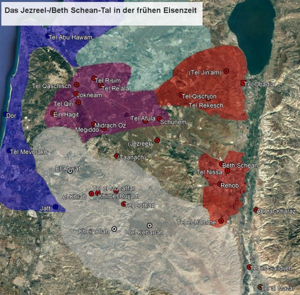 Solange so viele Orte im Jezreel-Tal noch auf ihre Ausgrabung warten, wird die Zugehörigkeit der Ortsgruppe letztlich weiterhin ungewiss bleiben. Klar ist immerhin, dass die Jezreelebene ab dem 9. Jhd. nicht mehr (philisto-)kanaanäisch ist: Jezreel Nordost geht unter; Jezreel West blüht unter israelitischer Herrschaft kurz auf, wird aber kurz darauf mit Jezreel Südost zur umkämpften Grenzregion zwischen Aram und Israel (s.u.; vgl. Niemann 2006), bevor beide gegen Ende des 8. Jhds. von den Assyrern erobert und gemeinsam mit Galiläa im Norden Palästinas zur Provinz Magidu zusammengefasst werden. Im 12. Jhd. mit den phönizischen und philistäischen Gebieten an der Küste und den drei bis vier kanaanäischen Enklaven im Inland Palästinas befinden wir uns übrigens schon tief in der Richterzeit und hat die Eroberung von ganz Palästina unter Josua (Jos 10,41) angeblich schon lange stattgefunden; im 9. Jhd. mit nur leicht anderer Raumgliederung ist angeblich das Großreich von David und Salomo bereits wieder in Nord- und Südreich zerfallen.
