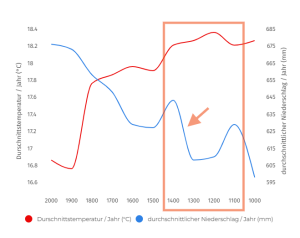 Klimawandel in Palästina von der mittleren Bronze- bis zur frühen Eisenzeit. Nach Soto-Berelov u.a. 2015, S. 106.〈b〉
