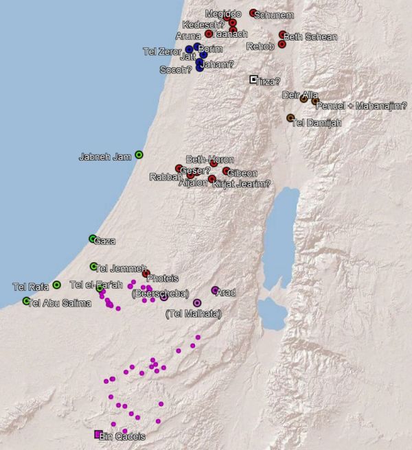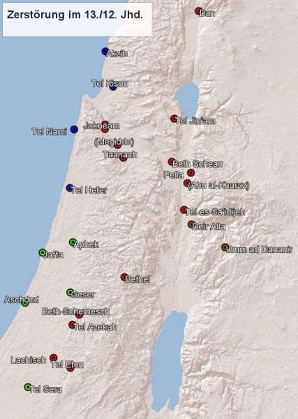 Drittens zeigt uns die Archäologie, dass viele der kanaanäischen Städte um das 13./12. Jahrhundert im Laufe von etwa 100 Jahren zerstört und erst später und nur zum Teil wiederrichtet wurden; manchmal nach einer Besiedlungslücke von über einem Jahrhundert (s. rechts; grob nach Millek 2018. Zu Pella und Abu al Kharaz vgl. Halbertsma 2019, S. 55f.). Es fällt auf, dass fast alle um diese Zeit zerstörten Städte erstens in den wirtschaftlich interessantesten Regionen Palästinas lagen, für die aus früherer Zeit daher auch mehrere ägyptische Expeditionen belegt sind – die Küste, das Jezreel-Tal bei Megiddo und das Aijalon-Tal bei Geser –, und dass sie zweitens danach phönizisch (blau) oder philistäisch (grün) sind oder an philistäisches Gebiet angrenzen (Beth-Schemesch, Azekah, Lachisch, Eton, Beit Mirsim). Zu Qaschisch, Jokneam, Megiddo, Beth-Schean, Pella und Abu al-Kharaz s.u.: Offenbar siedelten auch hier außerhalb des philistäischen Kerngebiets Angehörige der Seevölker (Taanach blieb zunächst unbesiedelt). Aussagekräftig ist auch, welche Städte nicht zerstört wurden: In der direkten Nachbarschaft von Beth-Schean etwa blieben Rekesch und Rehob, in denen sich später auch keine Seevölker nachweisen lassen, bestehen. Auch die umgebenden Dörfer scheinen jeweils nicht zerstört und weiterhin bewohnt worden zu sein (s z.B. Gaß 2006, S. 110; Finkelstein 2014, S. 31-34), was ebenfalls für gezielte Eroberungen spricht. Es ist zwar richtig, das sich bei einer noch größeren Zahl der später philistäischen oder phönizischen Städte keine Zerstörung feststellen lässt (Millek 2021), aber die Regelmäßigkeit ist dennoch zu deutlich, um dies gut anders denn als Eroberungen durch die Seevölker deuten zu können – nur Dan, Jin'am, Bethel und auf der anderen Jordanseite Umm ad Dananir fallen aus diesem Muster und müssen anders erklärt werden.〈f〉 Bethel und Umm ad Dananir sind auch die einzigen um diese Zeit zerstörten Städte, die im Gebirge liegen. Dass man bei vielen der späteren Seevölker-Städte keine Zerstörung feststellen kann, sollte man daher besser damit erklären, dass Eroberungen im Alten Orient häufig in Form von Blockaden geschahen, die die hungernden und dürstenden Bewohner dazu bringen sollten, sich zu ergeben (vgl. Eph´al 2009, S. 35-43). Von solchen Blockaden durch die Philister berichtet die Bibel z.B. in 1 Sam 23,1-5; 28,4; 2 Sam 5,17f. Den Sinn solcher Belagerungen durch siedlerkoloniale Mächte wie die Philister zeigt uns Dtn 20,10f.. Viertens: Nachdem die Philister auch in die ebenfalls unter der Dürre leidenden Reiche der Ägypter und der Hethiter eingefallen waren und auch die Assyrer mehrere Kriege gegen die Hethiter geführt hatten, geht das hethitische Großreich unter. Spätestens dem 12. Jhd. (Kaniewski u.a. 2011) lassen sich stattdessen nördlich von Palästina die Anfänge eines weiteren, Palistin genanntes und noch größeres philistäisches Reich nachweisen, das wohl bis ins 9. Jhd. Bestand hatte (vgl. z.B. Hawkins 2009; Gilan 2013b, S. 63f.; Weeden 2013; Pucci 2020, S. 137f.; ähnlich Emanuel 2015). Ob es östlich wirklich bis Nampigi reichte, ist unklar; die Türkei, Libanon und Syrien sind archäologisch noch weniger gründlich erforscht als Palästina. Relativ sicher ist aber, dass damit Palästina spätestens ab dem 12. Jhd. nicht mehr eingezwängt war zwischen dem hethitischen und dem ägyptischen Großreich, sondern zwischen den palištim („Philistern“) im Südwesten und dem Königreich Palistin im Norden, und dass die Kanaanäer von Philistern und Phöniziern um gut die Hälfte der Fläche ihrer einstigen Herrschaftsgebiete gebracht worden waren. Dafür schwindet fünftens mit der Zerstörung der kanaanäischen Städte und der ägyptischen Residenzen in diesen Städten nach und nach auch die Präsenz der Ägypter in Palästina. Dass auf der Merneptah-Stele davon gesprochen wird, Merneptah habe Kanaan „gefangen genommen / erbeutet“ (26), wird man so deuten müssen, dass dieser Prozess um 1208 v. Chr. schon weit vorangeschritten war und Merneptah allenfalls noch einmal kurz „das Ruder herumriss“; da in Megiddo und Lachisch aber noch Monumente des in den 1140ern regierenden Pharao Ramses VI gefunden wurden, scheint auch diese Entwicklung gut ein Jahrhundert angedauert zu haben. Manche Forscher gehen außerdem davon aus, dass nach dem Zusammenbruch des Hethiterreiches auch viele flüchtende Hethiter nach Palästina einwanderten. Archäologisch lässt sich das aber nicht nachweisen; es ist daher unwahrscheinlich, dass dies in großem Stil geschah (Gilan 2013).