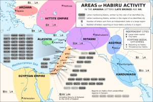 Politische Verhältnisse der frühen Spätbronzezeit. In Grau die Orte, für die Habiru allein durch die Amarna-Briefe belegt sind. Die Schasu scheinen überwiegend östlich und südlich von Kanaan (orange) gelebt zu haben. CC-BY-SA.3.0: Sémhur via Wikimedia