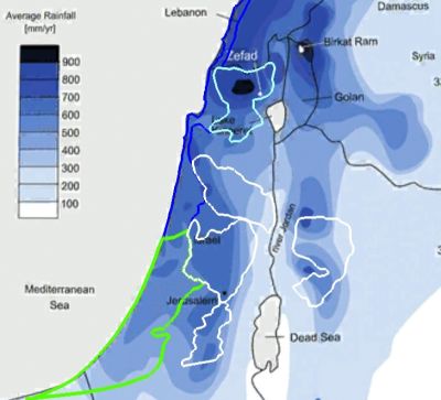 Ökonomisch lässt sich die Besiedelung des Zentralgebirges in der Klimakrise der frühen Eisenzeit gut erklären: Im Bergland Israels gibt es erstens höhere Niederschlagsmengen. Rechts sieht man, wie die fünf Berglandregionen sich überwiegend auf die am stärksten beregneten Gegenden des noch nicht durch Phönizier und Philister dominierten Palästina konzentrieren. Darüber hinaus ist an Hängen der Effekt von Niederschlag größer, weil zusätzlich zum lokalen Niederschlag auch noch Rinnwasser den Boden befeuchtet und weil wegen des felsigen Untergrunds das Wasser langsamer versickert. Durch künstliche Terrassen lässt sich dieser Effekt noch steigern (vgl. zur Technik z.B. Evenary u.a. 1982, S. 109; Hopkins 1985, S. 173-186; Gibson 2015, S. 298-303; Ackermann u.a. 2018). Radiokarbon- und OSL-Datierungen von Terrassen machen wahrscheinlich, dass man Terrassenbau mindestens schon in der frühen Eisenzeit praktizierte (vgl. z.B. Avni u.a. 2012, S. 24; Pola u.a. 2016, S. 92; Bruins/van der Pflicht 2017).〈h〉 Evenary u.a. haben für den Negev kalkuliert, dass man so mit bis zu vier Fünftel weniger Niederschlag auskommt. Weiters hatte man offenbar erst kurz zuvor die Technik entwickelt, Zisternen in den weichen Kreidestein zu hauen, in denen zusätzliche Wasservorräte gespeichert werden konnten (vgl. Callaway 2009, S. 39f.). Auch solche Zisternen finden sich daher in großer Zahl in ausgegrabenen Hochlandsiedlungen der frühen Eisenzeit. Außerdem gab es in der ausgehenden Bronzezeit mit ihren schwächer sprudelnder Flachlandbrunnen und -Quellen noch eine Reihe natürlicher Gebirgsquellen fern von bereits bewohnten Siedlungen, die noch beansprucht werden konnten und in deren Nähe daher viele der neu errichteten Siedlungen liegen (vgl. z.B. Gal 1992, S. 86; Zertal 1988, S. 343-345).〈i〉 Höhere Niederschlagsmenge, wassersparende Terrassentechnik, wasserspeichernde Zisternentechnik und frei verfügbares Quellwasser muss das Gebirge in den Zeiten der Dürre zu einem immer attraktiveren Ort für palästinische Viehhirten und Landwirte gemacht haben. Die ökonomischen und ökologischen Hintergründe dieser kleinen Volkswanderung lassen sich also gut erklären. Die politischen Hintergründe dagegen sind sehr umstritten.