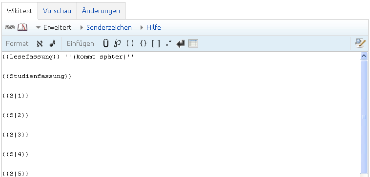 Die entsprechenden Werte der jeweiligen Attribute (z.B. „Alle Verse“, „Alternativen“ etc.) werden einfach direkt hinter dem Gleichheitszeichen eingetragen, am besten (zwecks Übersichtlichkeit) nach einem Zeilenumbruch. Das sähe im Bearbeitungsmodus dann etwa so aus: