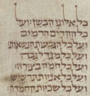 In hebräischen Schriften wirken diese Zeilen noch eindrücklicher: In vielen Handschriften entspricht die Länge dieser Zeilen genau einer Standard-Zeile, so dass der Leser sich schon auf den ersten Blick mit einer langen Liste konfrontiert sieht, deren jedes Item mit dem selben Wort beginnt. Rechts ein Beispiel aus der Handschrift Erfurt 3. (Zurück zu v.16)